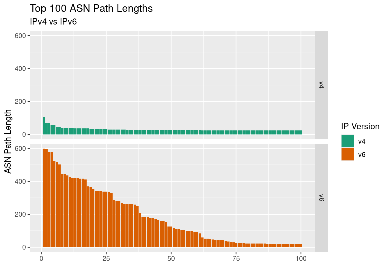 Why is there such a difference between the largest IPv4 and IPv6 path lengths? I had a couple of different theories, but then looked at the total number of ASNs in all positions for those top 50 longest paths, and it became apparent what was happening: