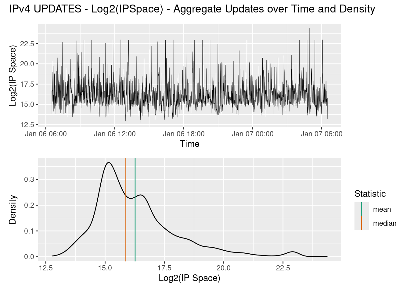 Below is the log2() IPv4 address space, viewed as a time series and as a density plot. It shows that on average, every 30 seconds, around 2^16 IP addresses (i.e a /16) change paths in the global routing table, with 95% of time time the change in IP address space is between \(2^{20.75}\) (approx. a /11) and \(2^{13.85}\) (approx. a /18).