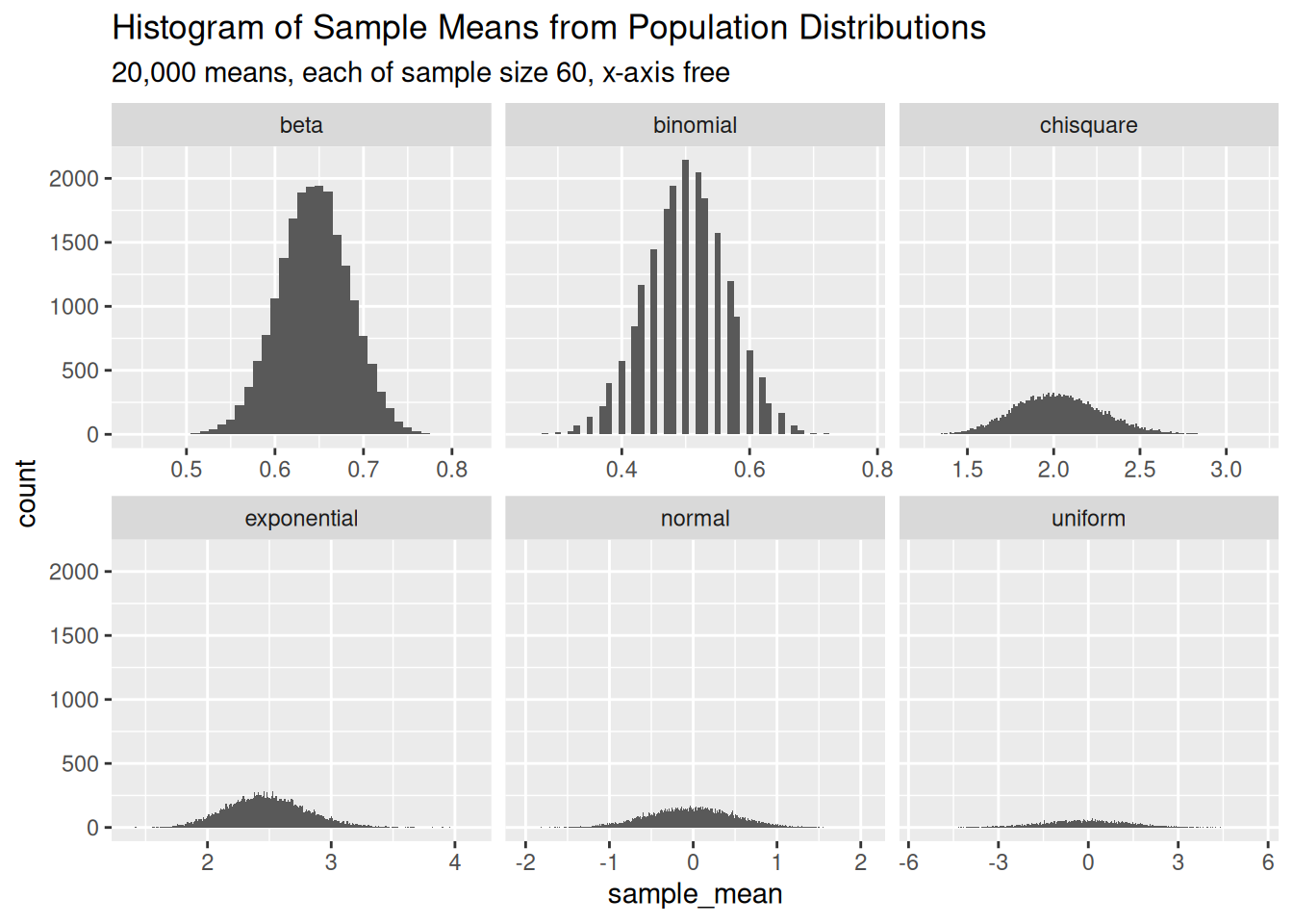 Here’s the resulting histograms of the samples with only the x-axis free to change scale. The beta and binomial look pretty normal, and the others might be as well, but the differences in variance make it difficult to tell.