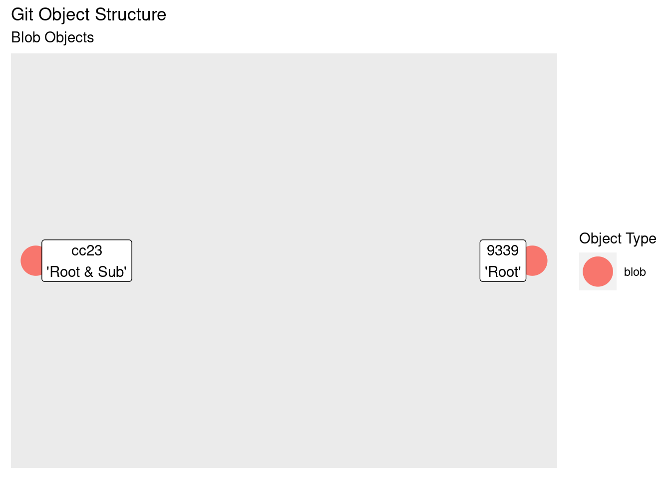 While we’ve added three files but there’s only two objects. Blobs only contain raw data, with no reference to files or directories. There’s only two pieces of unique data, and thus two objects. The file/directory information is stored in tree objects which we will take a look at in the next section.