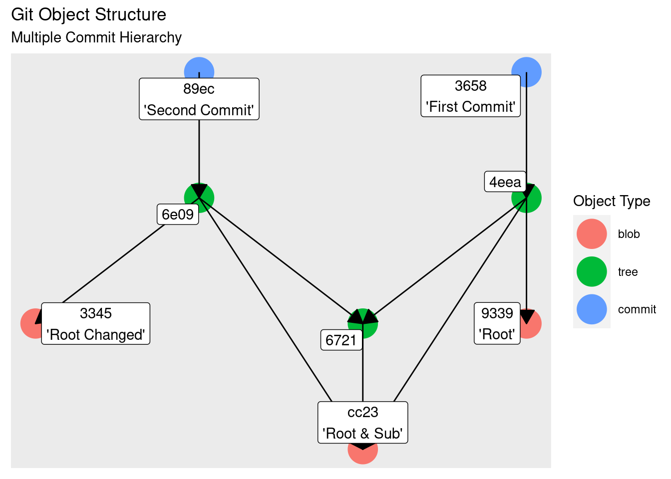 What we see here represents the core of how git stores data. The commits represent ‘snapshots’ of the state of the files and directories in the repository. In this particular scenario commits point to different root tree objects, each of which point to different objects representing the file_x. But they share the same tree object representing the subdirectory and the blob representing file_y.