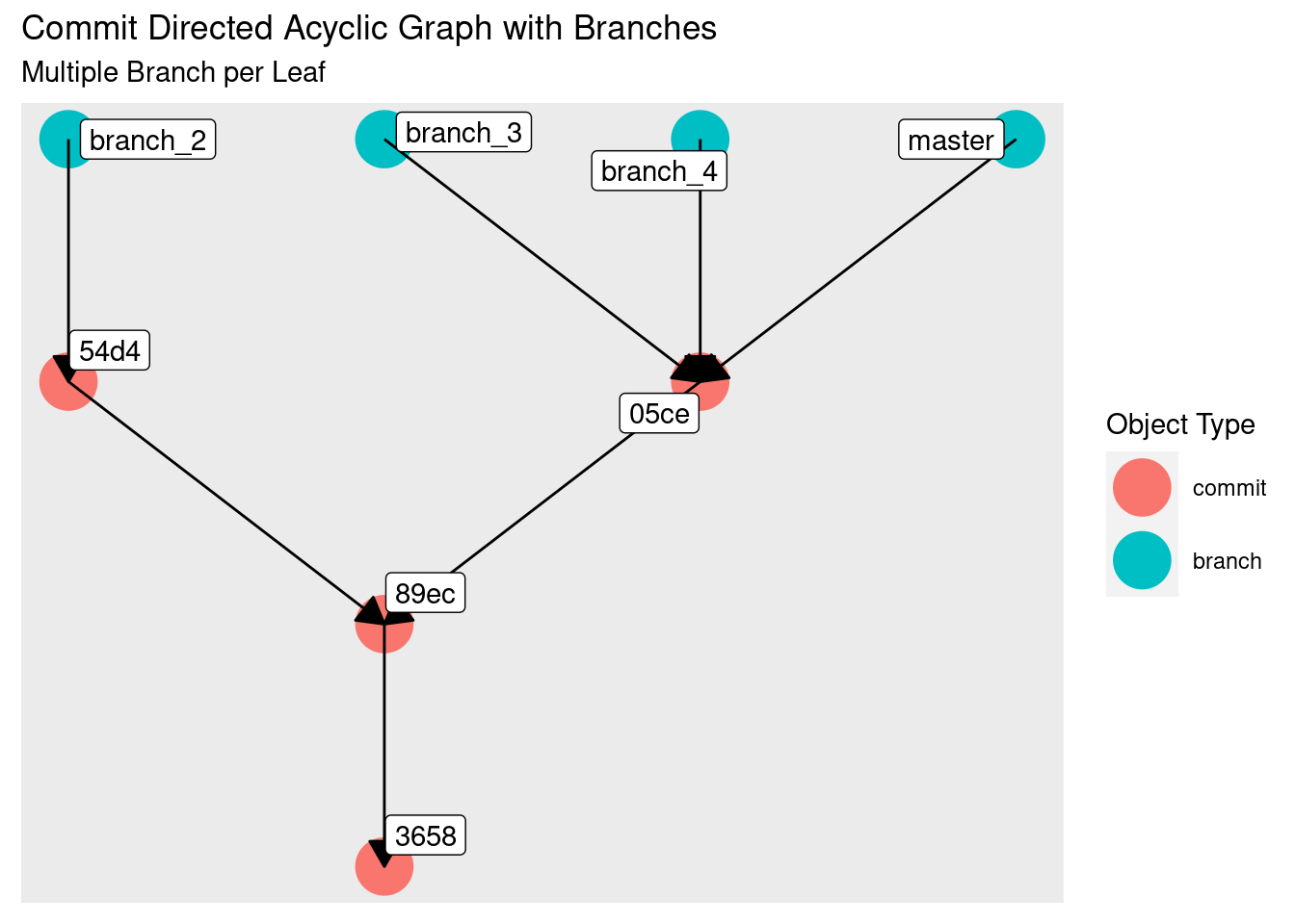 git {init, add, commit, branch, checkout}. All other work will be done using standard command line utilities. - Using the R packages git2r and tidygraph, we’ll dynamically build up a picture of the connections between git’s objects to help understand how they are tied together.