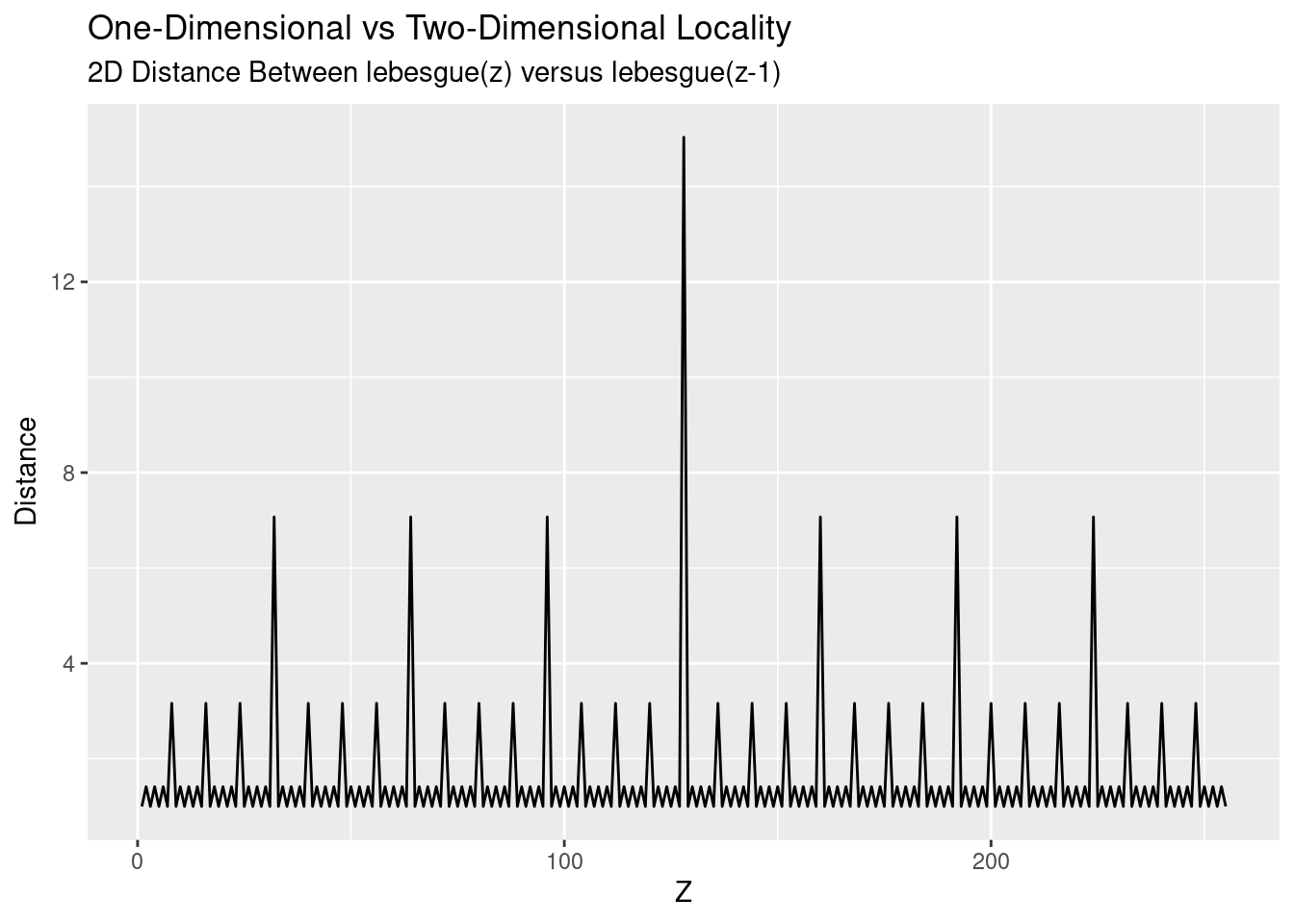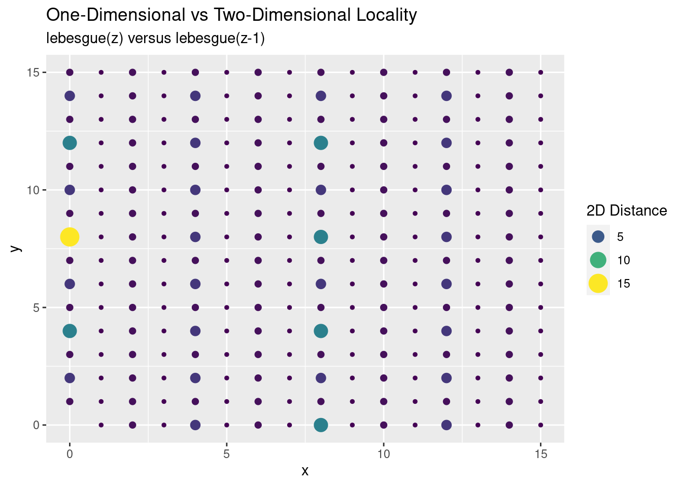 I mentioned at the start that the Lebesgue has ‘good locality’, but what exactly does this mean? There are multiple ways to define it, with a more rigorous take in this paper. I’ll be a little more little more hand-wavy and define it as “points that are close together in one-dimensions should be close together in two dimensions.”