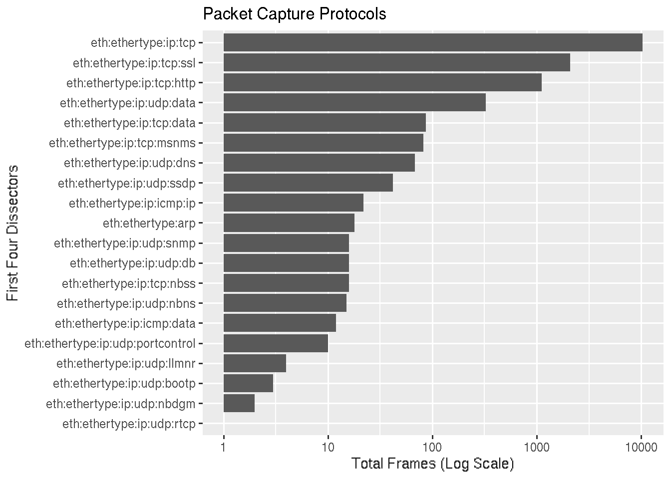 What struck me was that this perfectly described packet captures: each captured packet being and observation, and the values of the dissectors the variables. I wondered whether analysis of packet captures could be done with R and be the top-down compliment to Wireshark’s bottom-up approach.