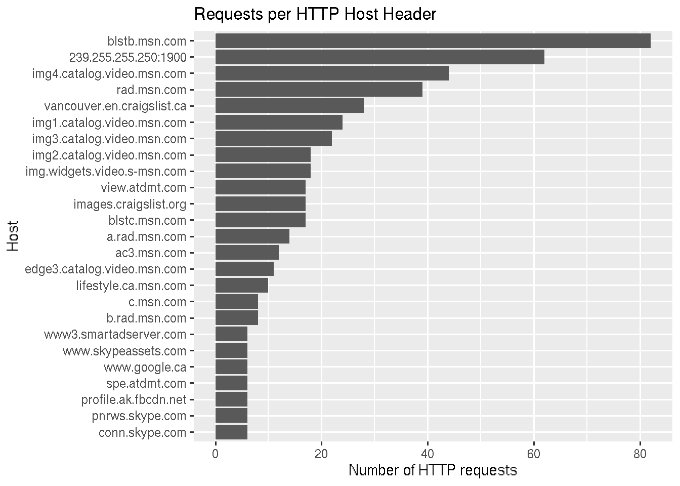 Now that we’ve got our data in to R, let’s explore it. To start with we’ll emulate some of the native outputs of Wireshark.