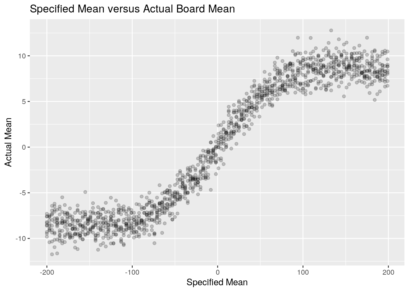 Due to the clamping, the mean we speciify in our argument to snl_board() doesn’t have a purely linear relationship to the evential mean of the entire board. We can see below that it actually resembles a logistic function.